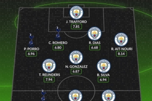 WhoScored根据球员上赛季至今的场均评分列出了曼城+热刺阵容,哈兰德、库杜斯在列,热刺仅3人入选。