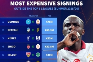 非五大联赛球队今夏最贵引援榜:奥斯梅恩、雷特吉、努涅斯前三
