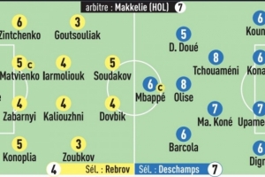 法国首发:迈尼昂6分、迪涅6分、于帕梅卡诺7分、科纳特6分、孔德6分、琼阿梅尼8分、科内7分、巴尔科拉6分、杜埃5分、奥利塞8分、姆巴佩6分