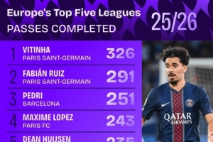 体育资讯9月12日讯 Squawka统计了本赛季球员在五大联赛的成功传球次数,并列出榜单。