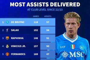 近3年俱乐部各项赛事总助攻榜:德布劳内仍居首,萨拉赫、B费在列