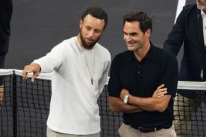 他与费德勒以及参赛选手们进行了合影,还抛硬币为比赛“开球”。