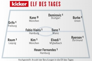 体育资讯9月22日讯 《踢球者》公布了本轮德甲最佳阵,凯恩和金玟哉领衔。