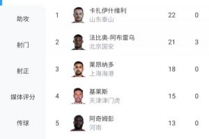 而榜首的泰山外援卡扎伊什维利本轮比赛未赛,同时0个点球。