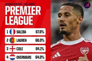 体育资讯10月1日讯 根据统计,在为阿森纳出战超过100场英超的球员中,萨利巴胜率最高,达到67.6%,这位法国中卫已与俱乐部续约至2030年。