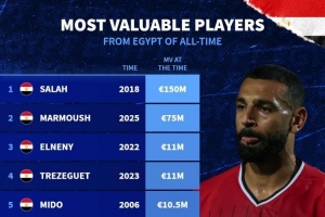 埃及球员历史身价榜:萨拉赫1.5亿欧居首,马尔穆什7500万欧次席