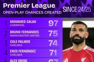 体育资讯10月16日讯 日前,Squawka统计了英超运动战创造机会次数排行,萨拉赫居首,B费、帕尔默分居二三位。