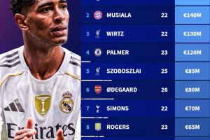 体育资讯11月2日讯 德国转会市场列出了进攻型中场身价排名,贝林厄姆1.8亿欧居首,穆西亚拉1.4亿欧次席。